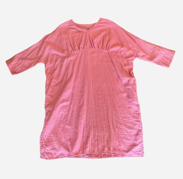 SIZE/身幅64cm×着丈109cm×裄丈78cm 素材/cotton100% Wガーゼ カラー/ピンク シンプルながらも肩の落ち感や繊細なギャザー ディテールにもこだわって作られています。 ポケット付きなのも嬉しいポイント。 ゆとりあるアームホールながらも、袖はすっきりとしていますので、 重ね着アイテムとしても活躍してくれますよ。 身幅の広い、ゆとりある着心地ですが ラインが すっきり見えるのも嬉しいところ 動く度に軽やかに揺れるシルエットも女性らしく素敵です ガーゼの風合いの良さを感じて頂ける1着です。