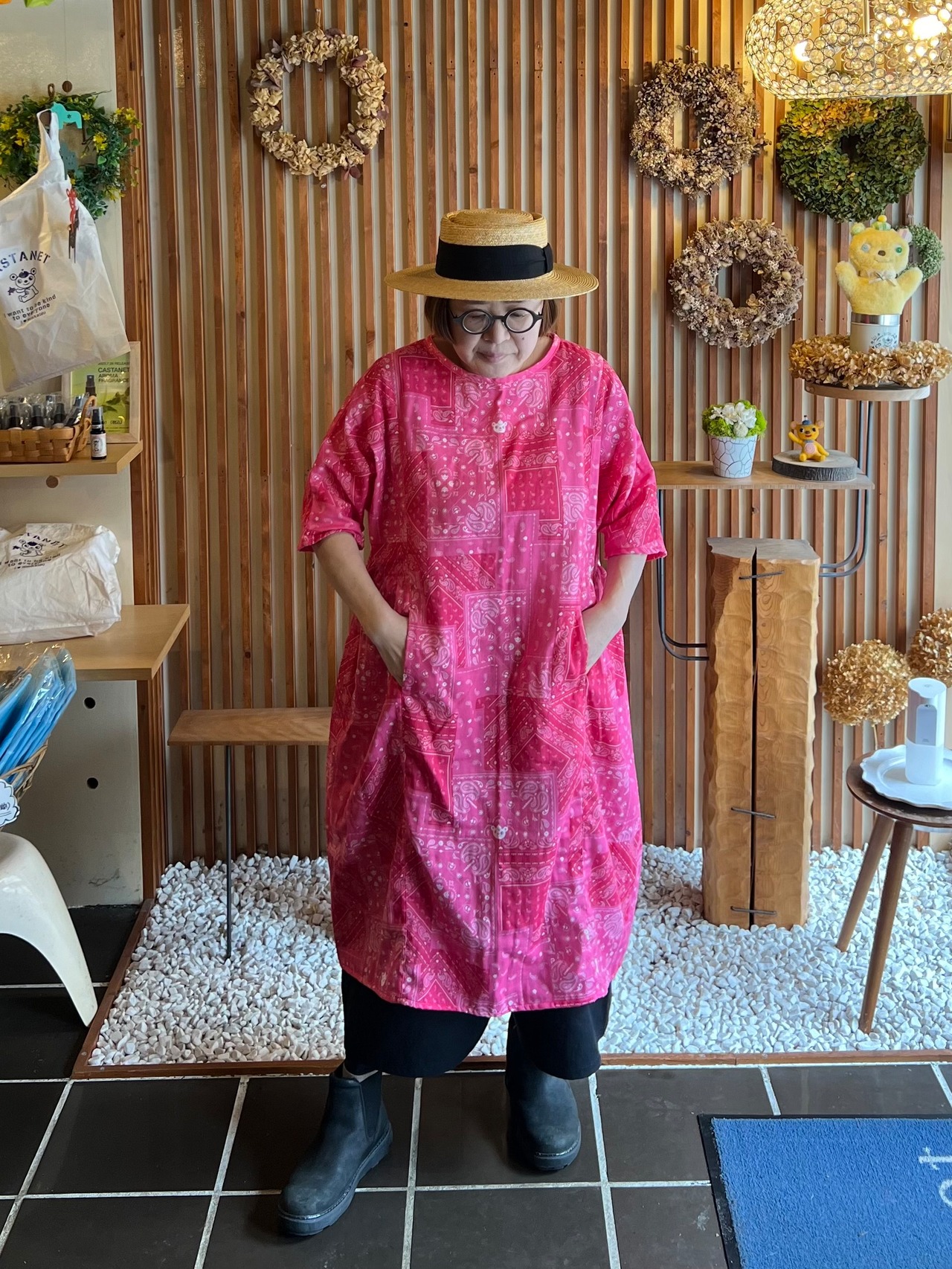 『バンダナ』五分袖ロングワンピース・ピンク