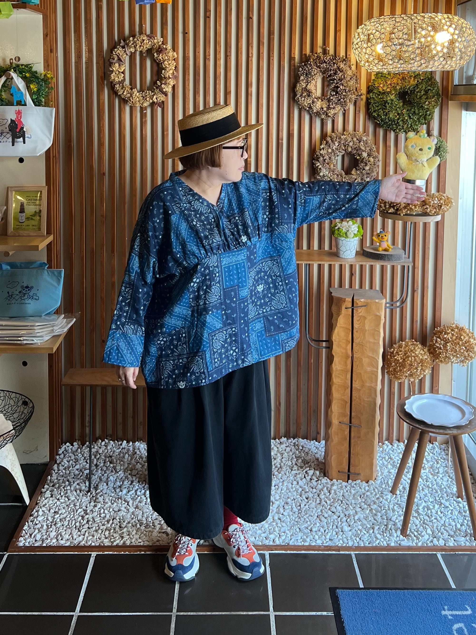 ガーゼ『バンダナ』Vネックギャザー長袖プルオーバー・ブルー