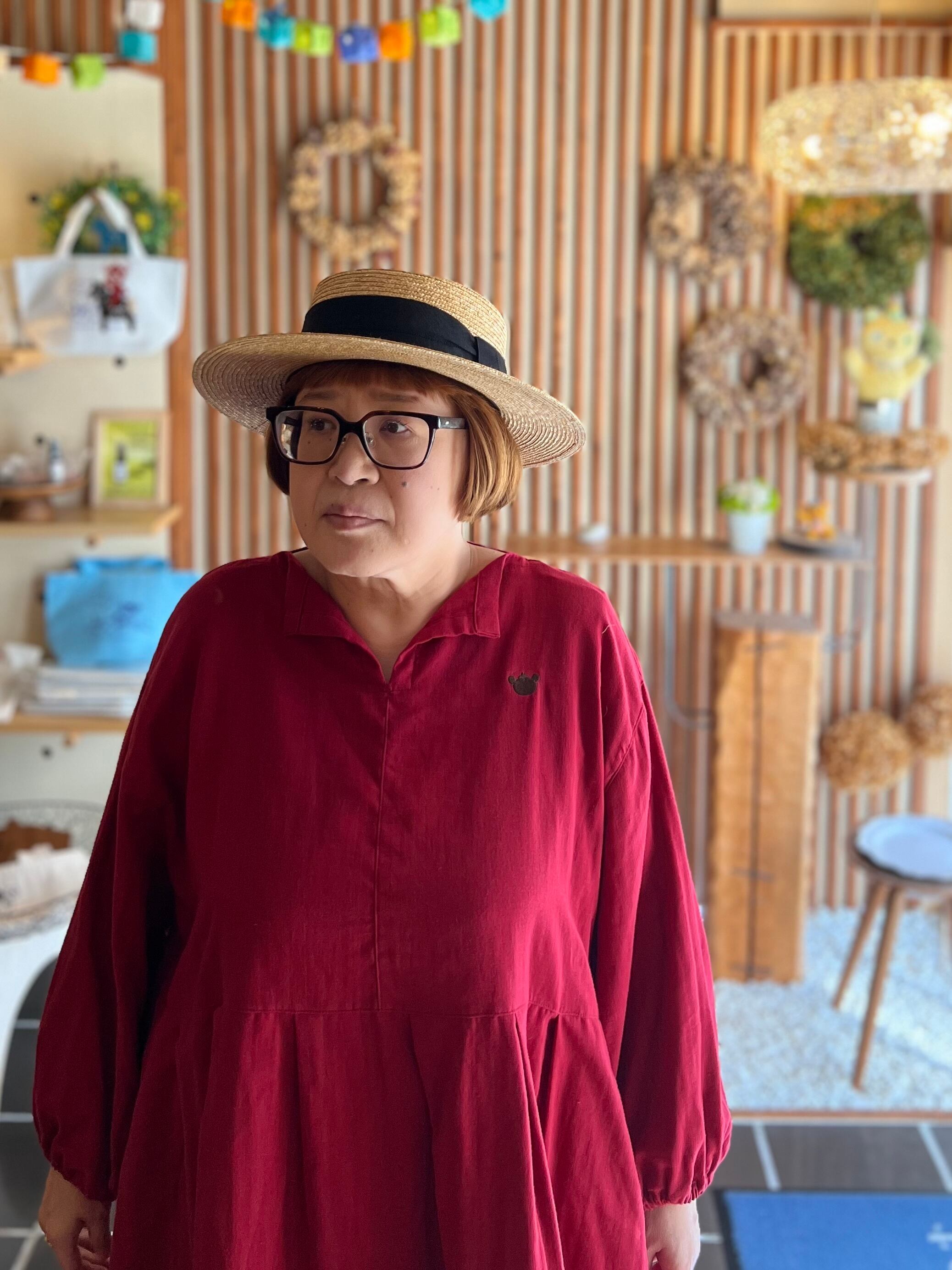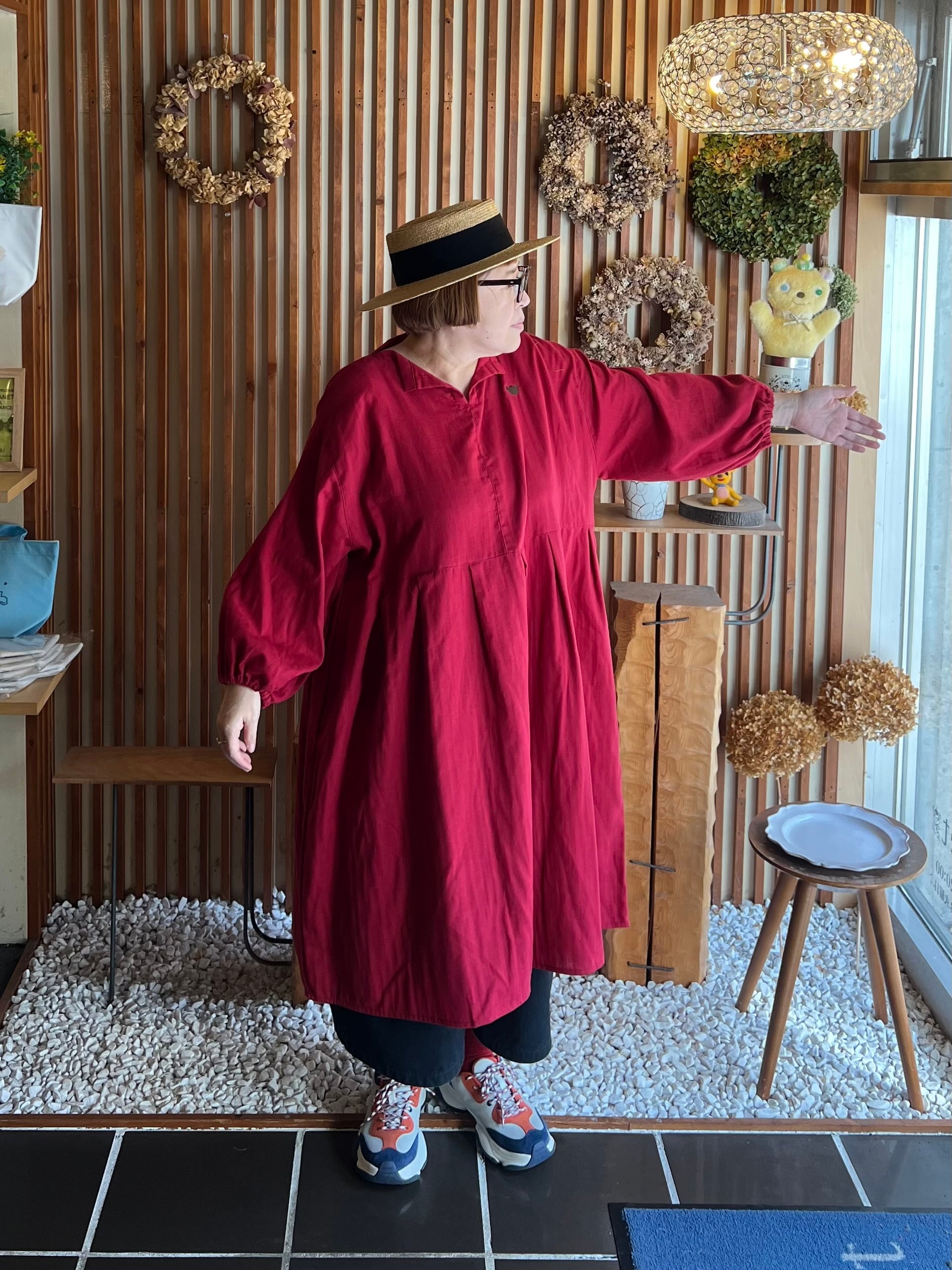 『ガーゼ』スキッパーワンピース長袖・ワインレッド