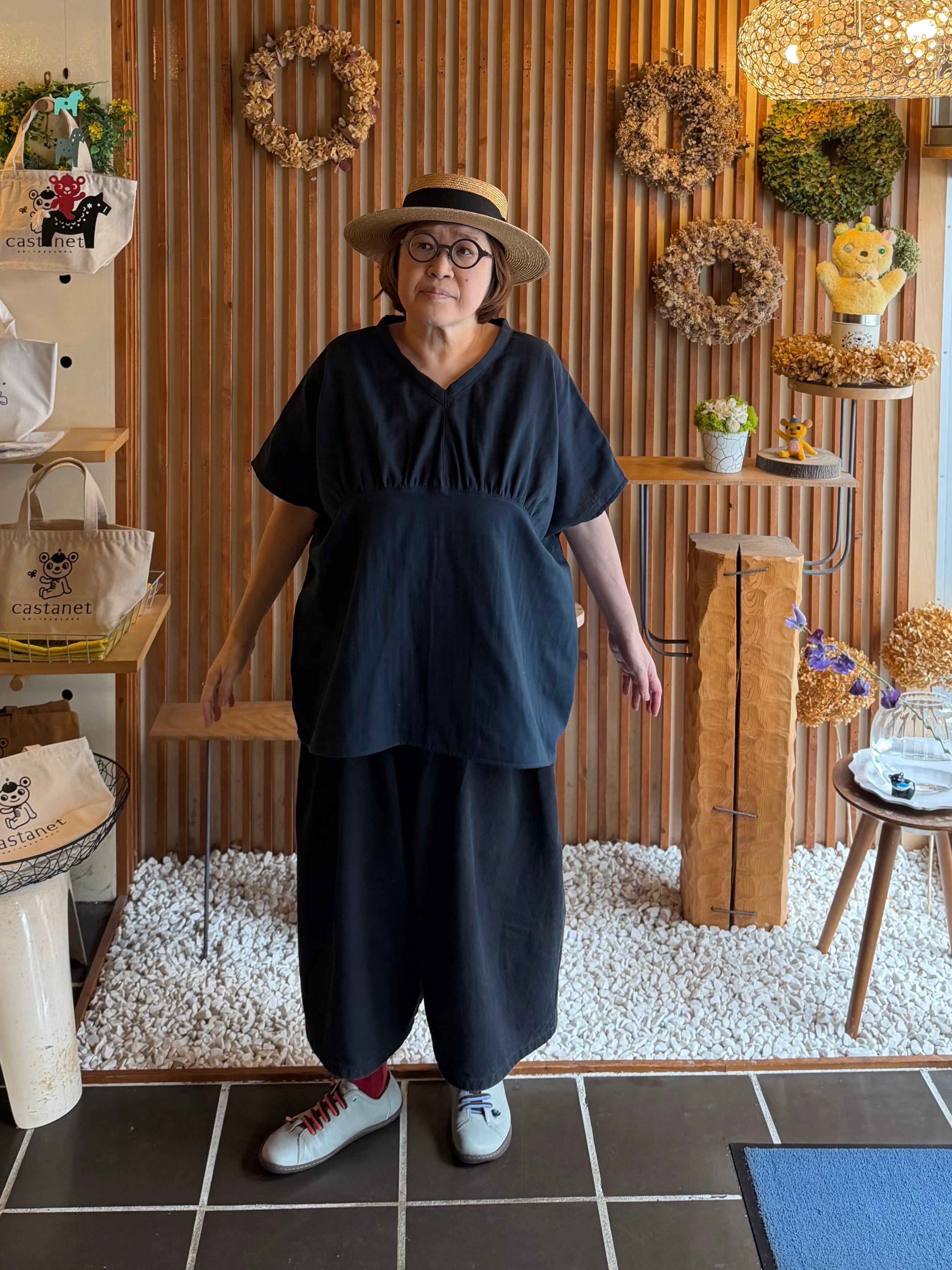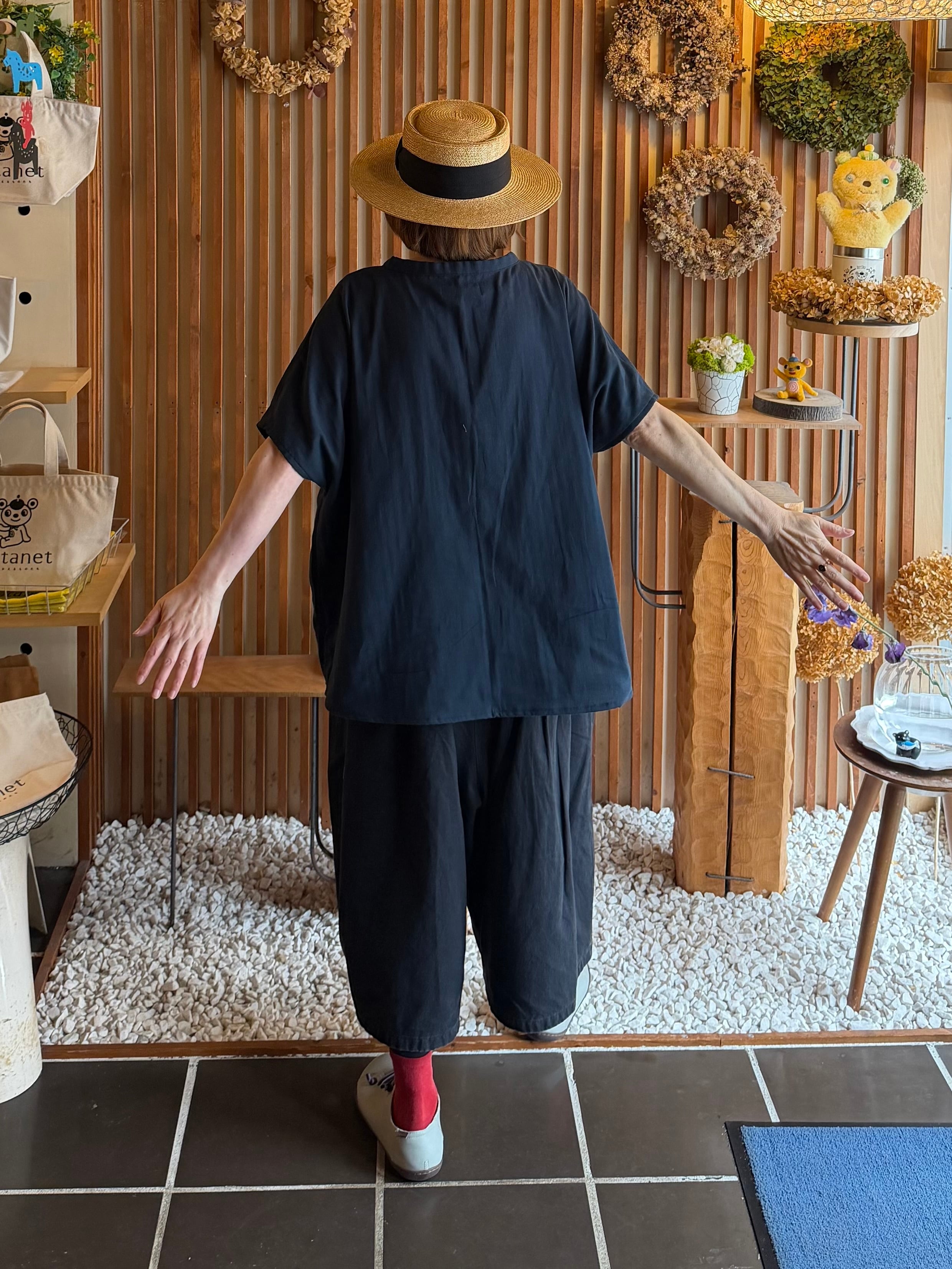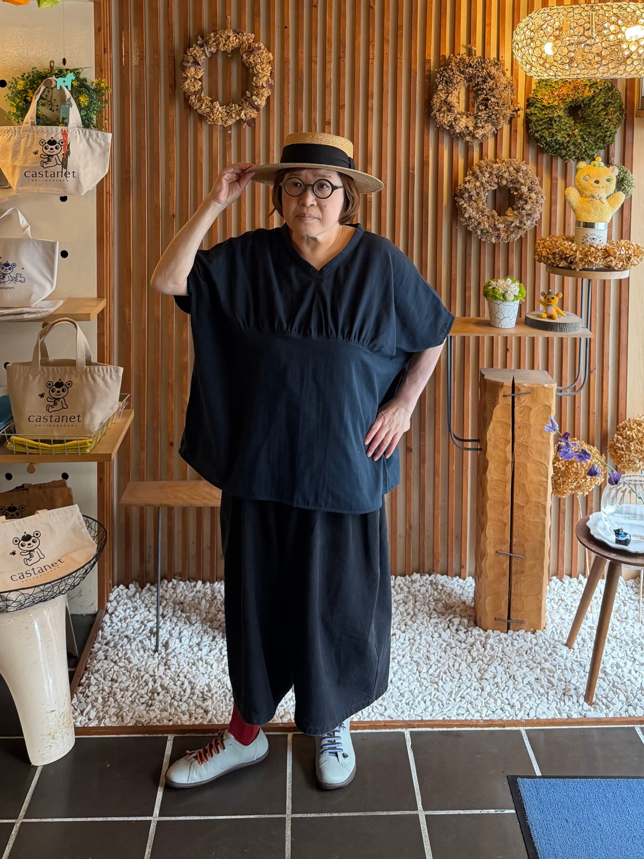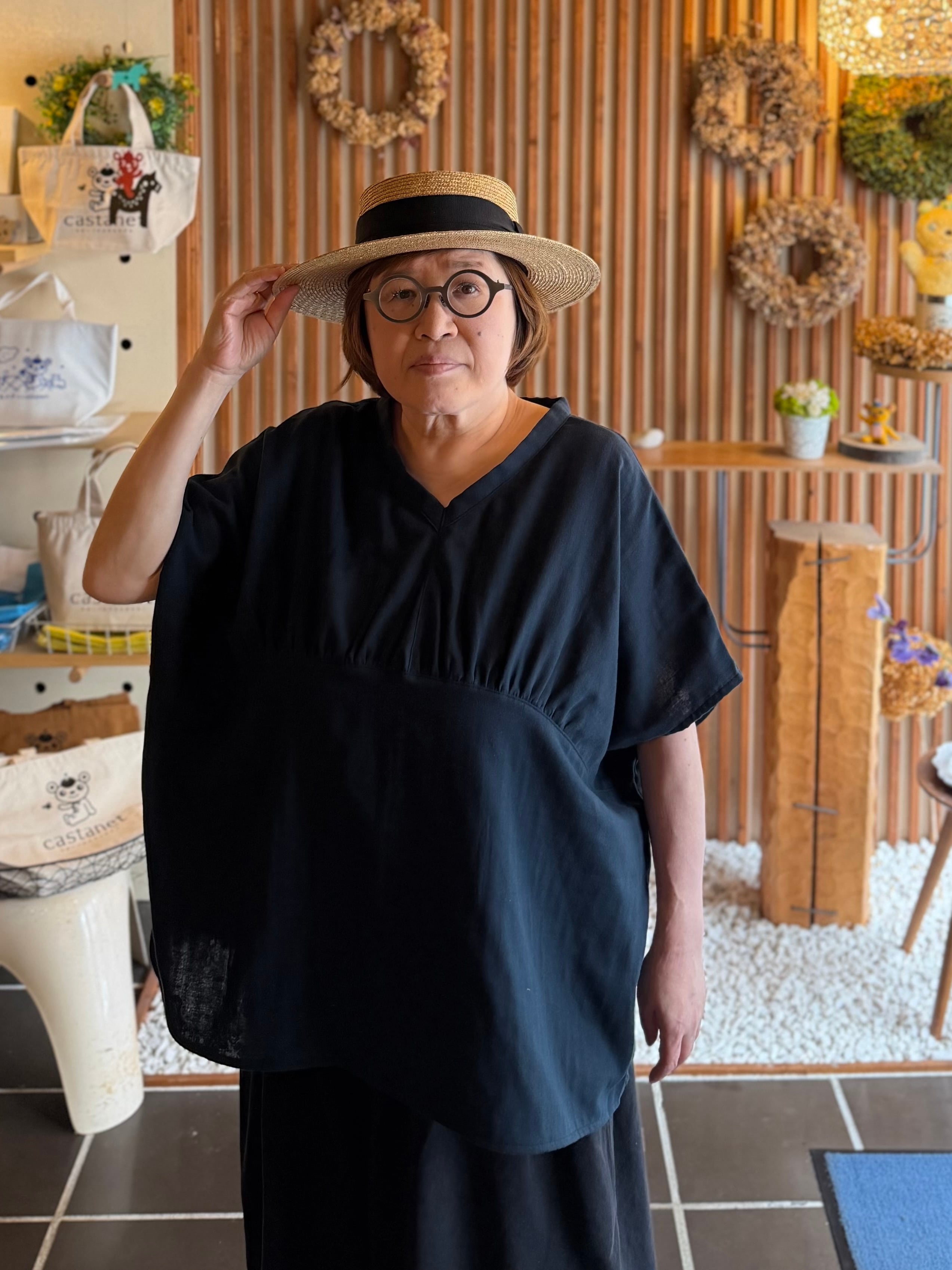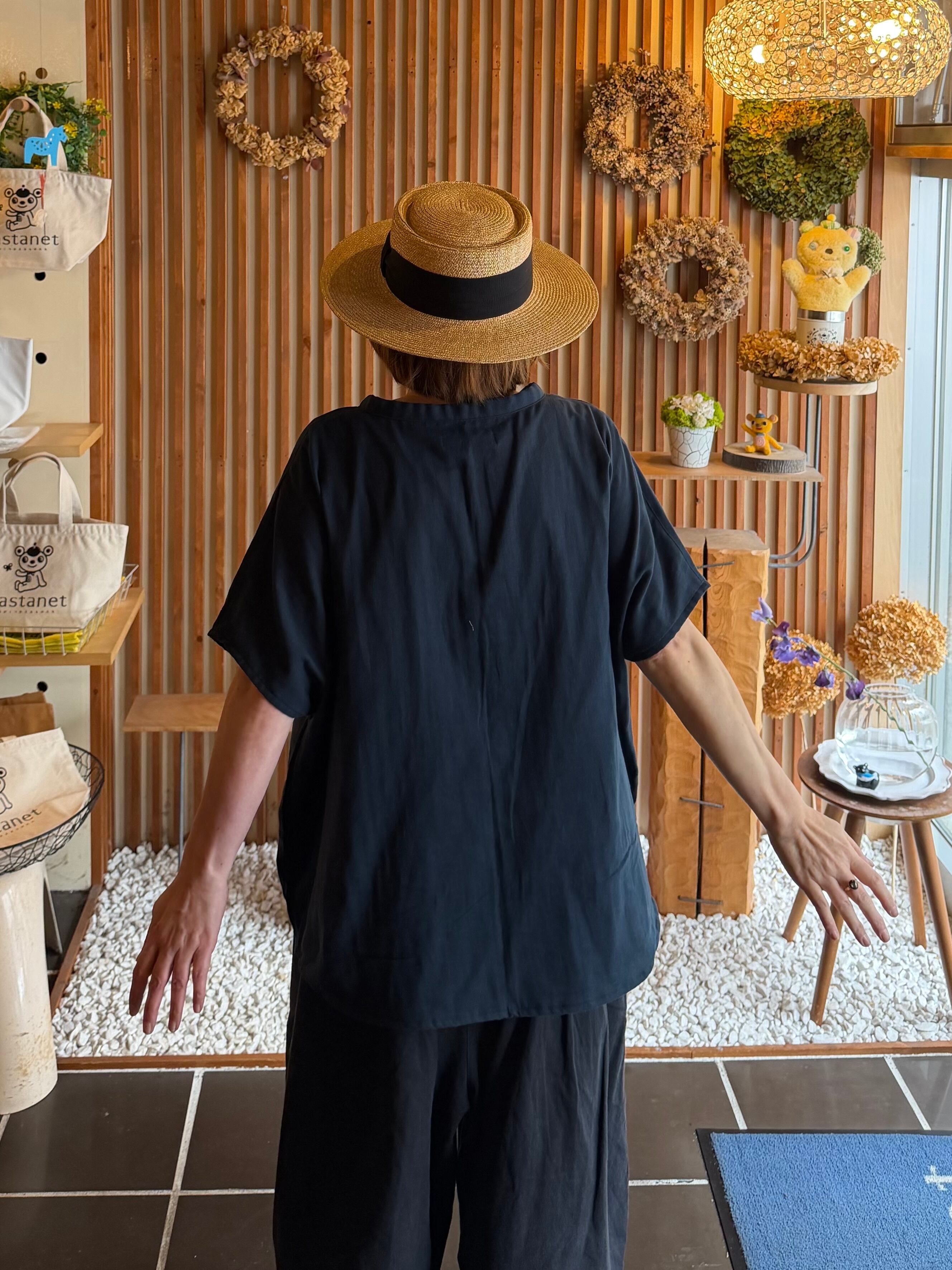 ガーゼ『Vネックギャザー半袖プルオーバー』ネイビー