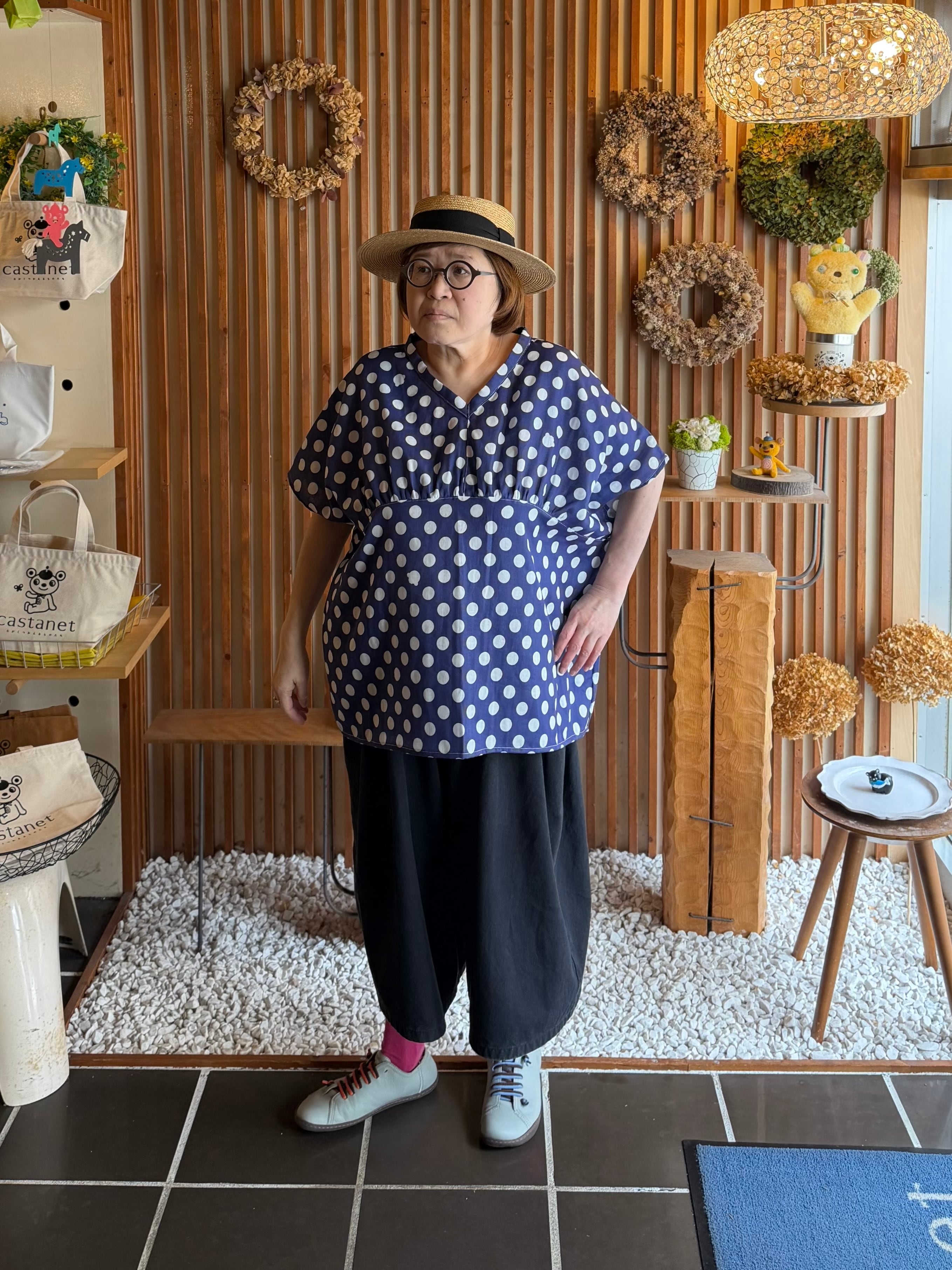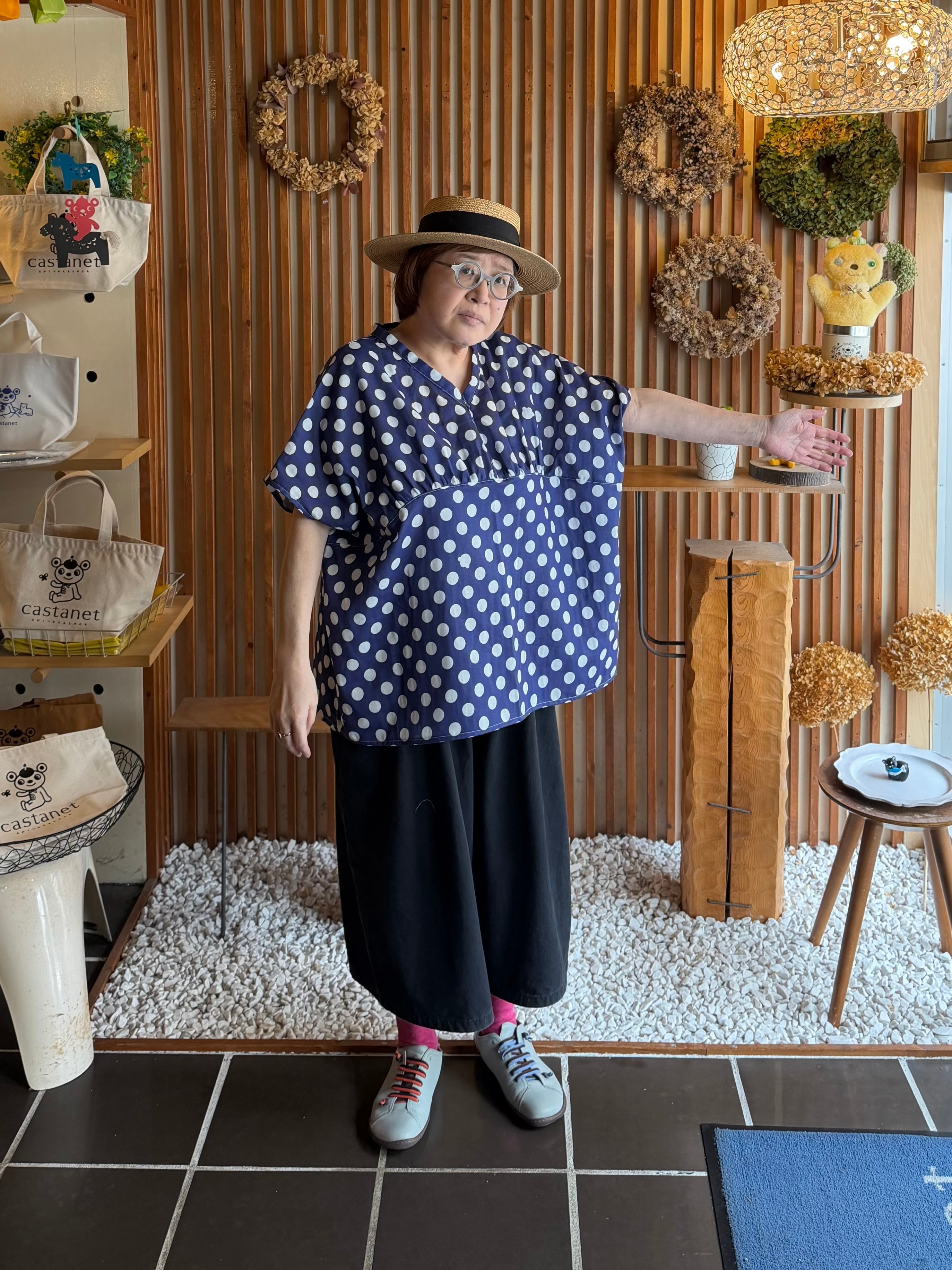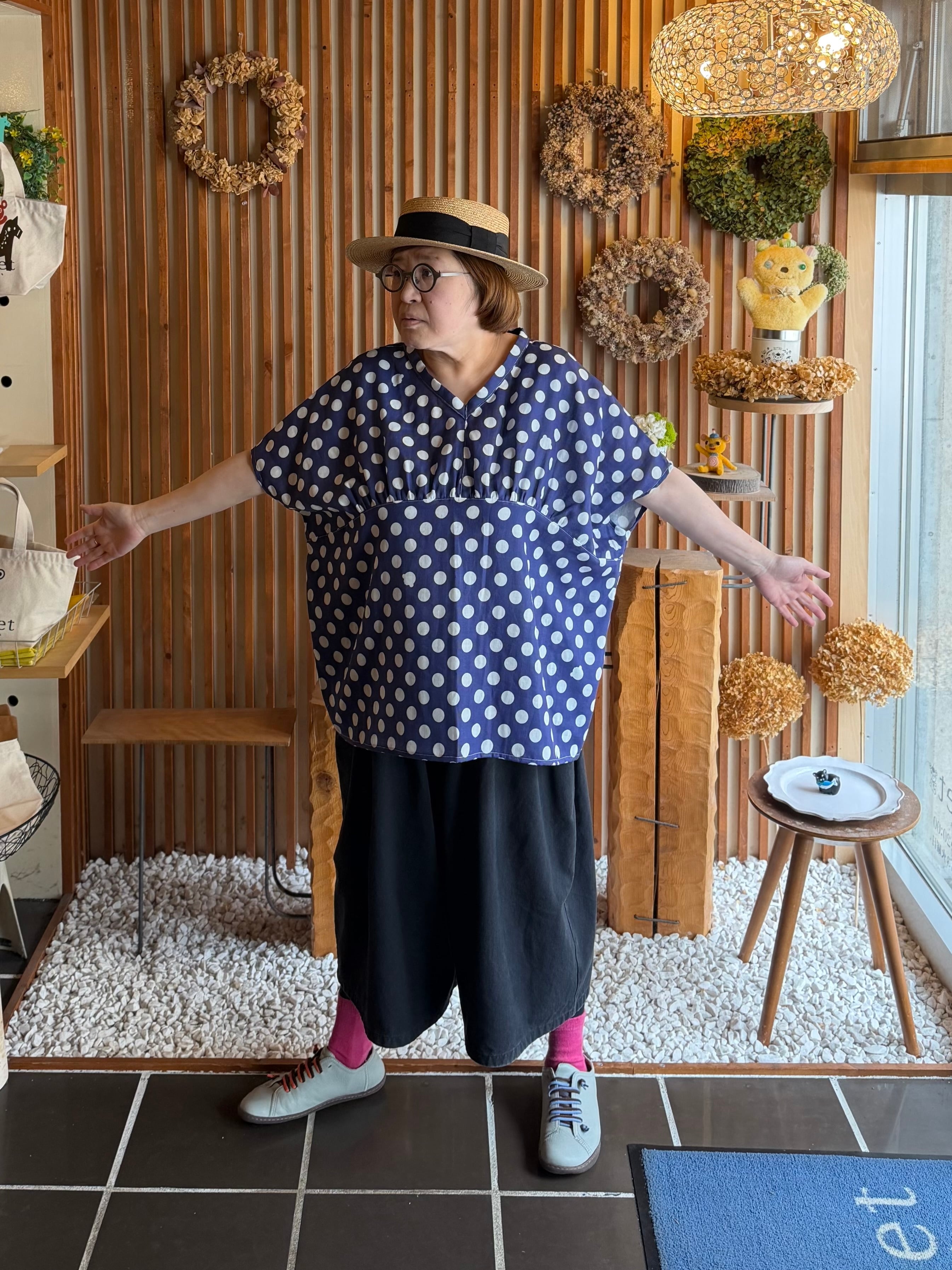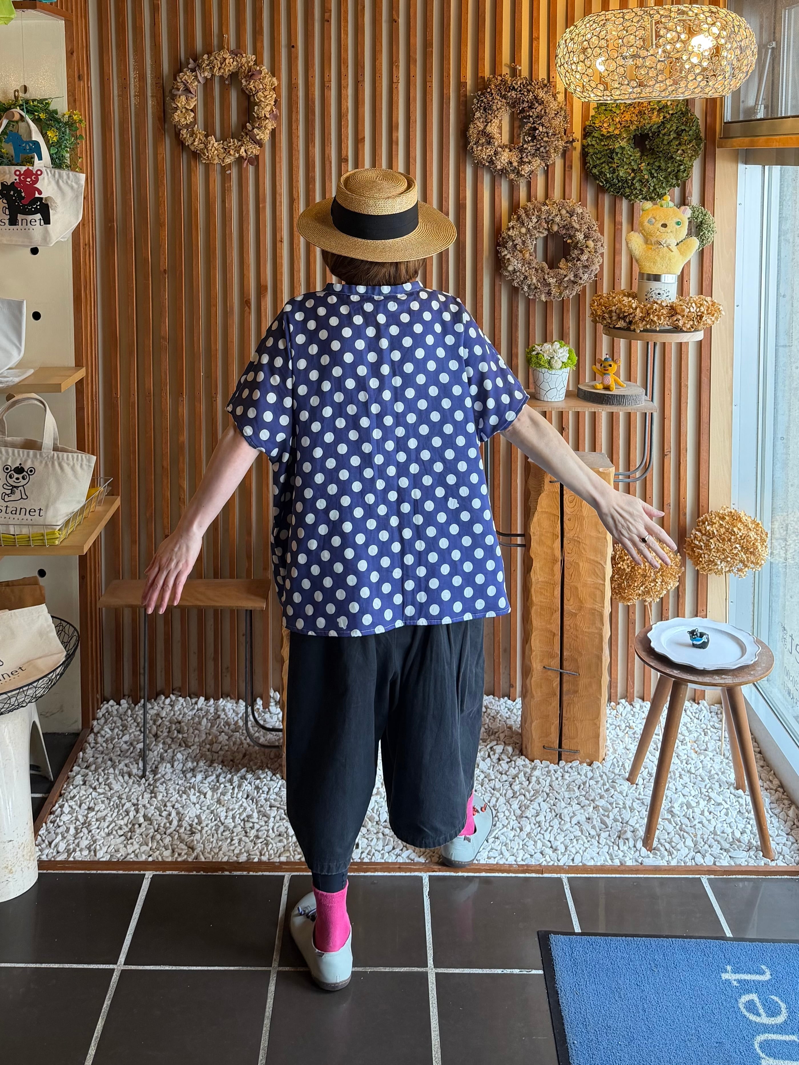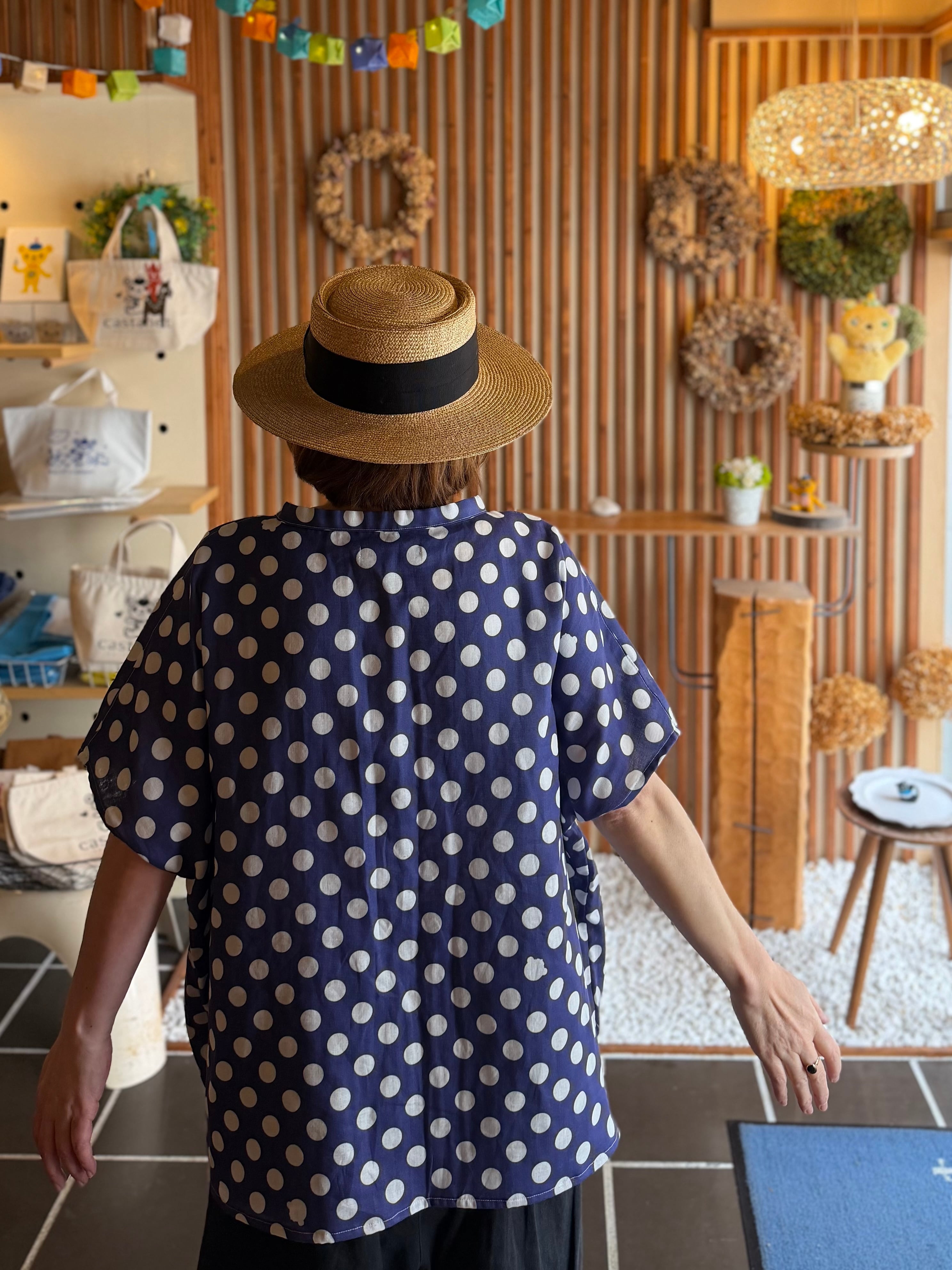ガーゼ『チビ水玉』Vネックギャザー半袖プルオーバー・ネイビー