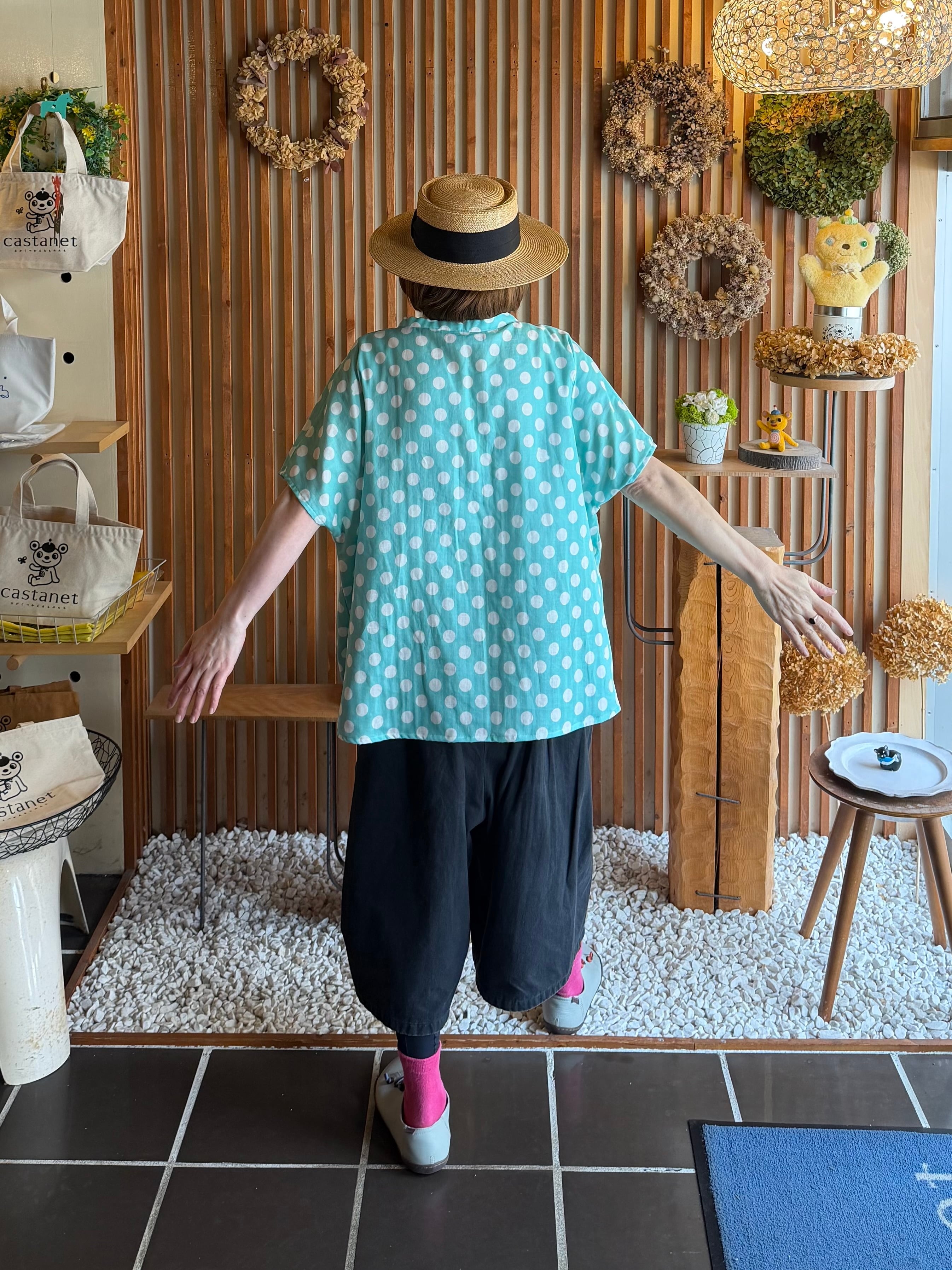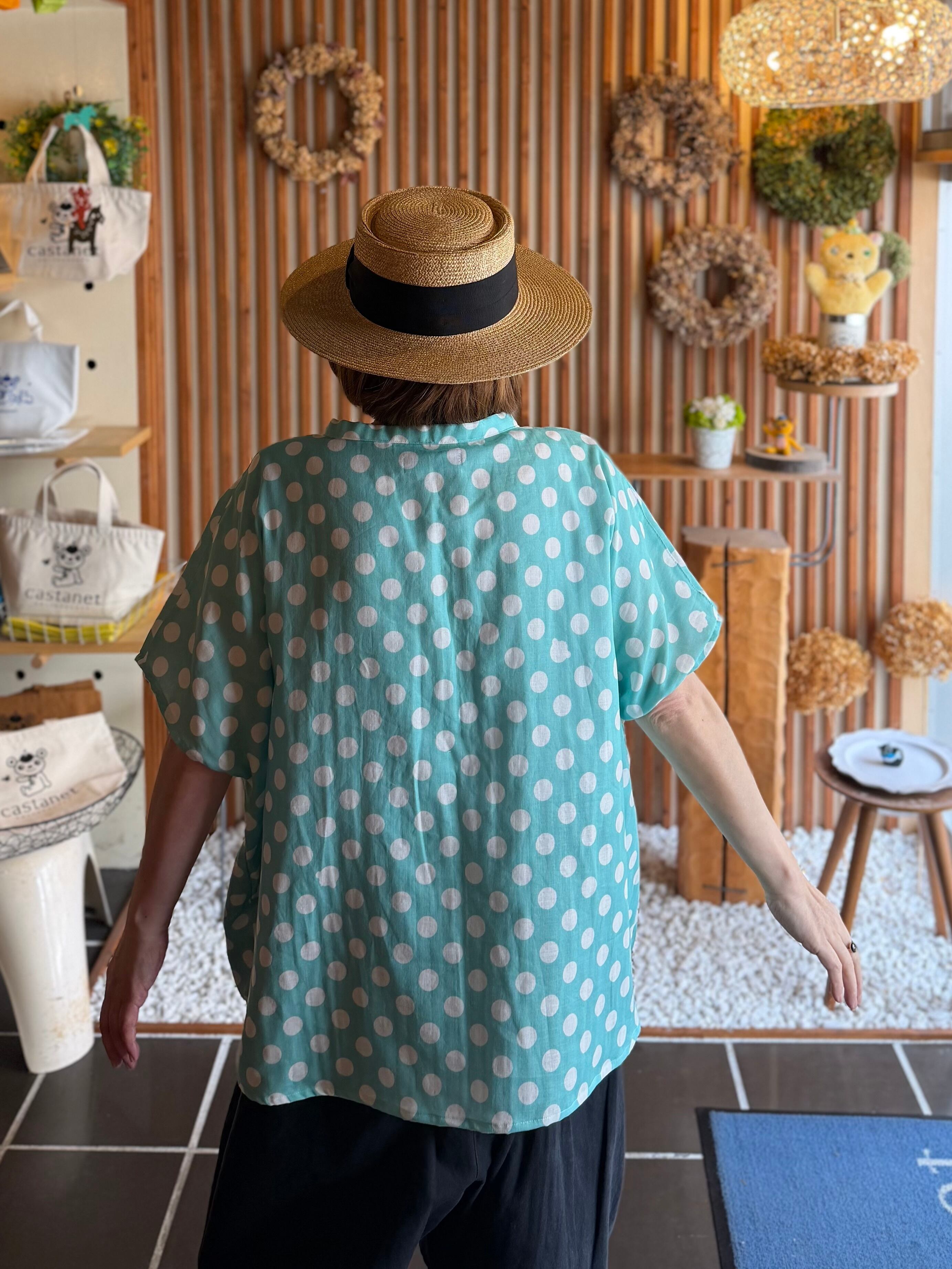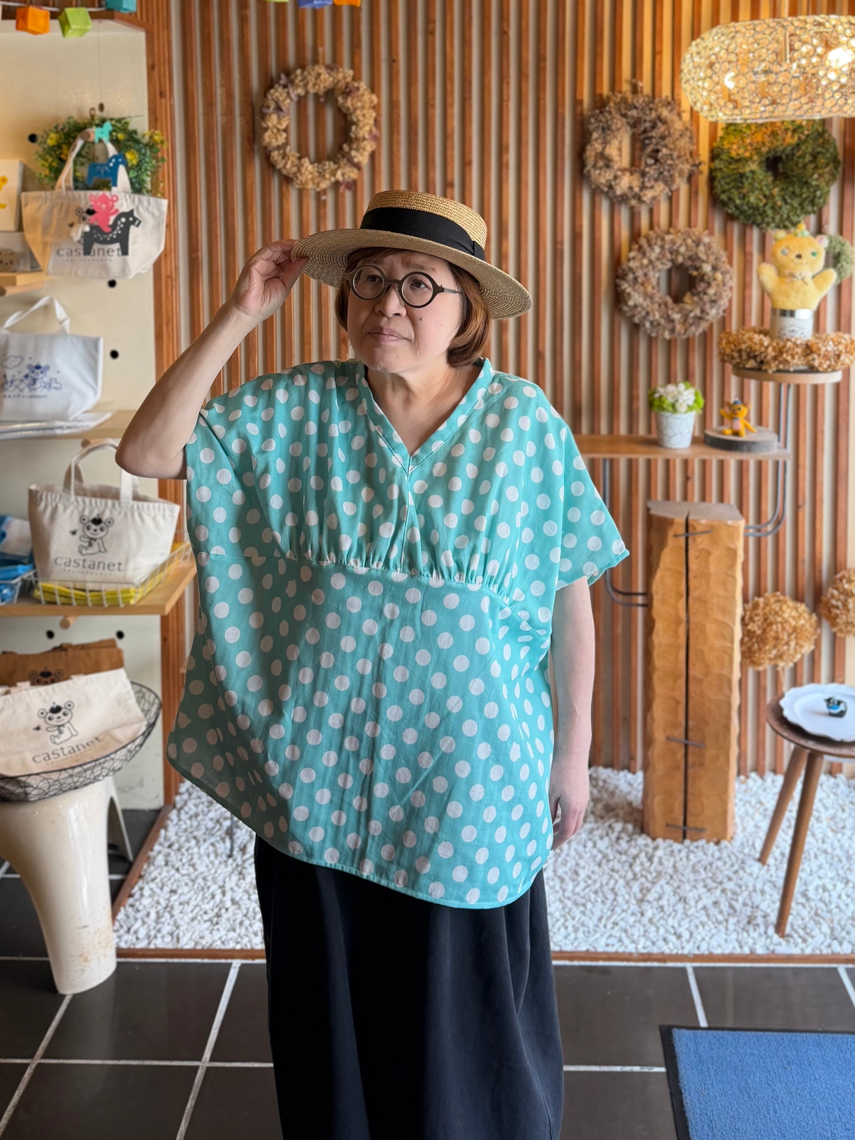 ガーゼ『チビ水玉』Vネックギャザー半袖プルオーバー・ミント