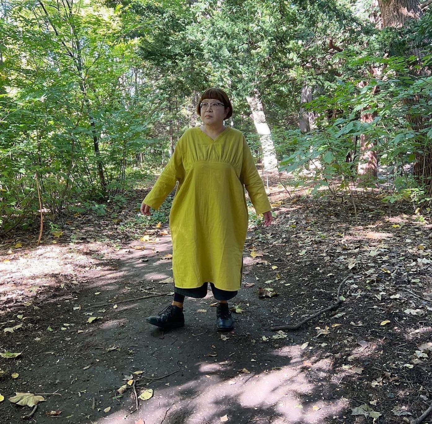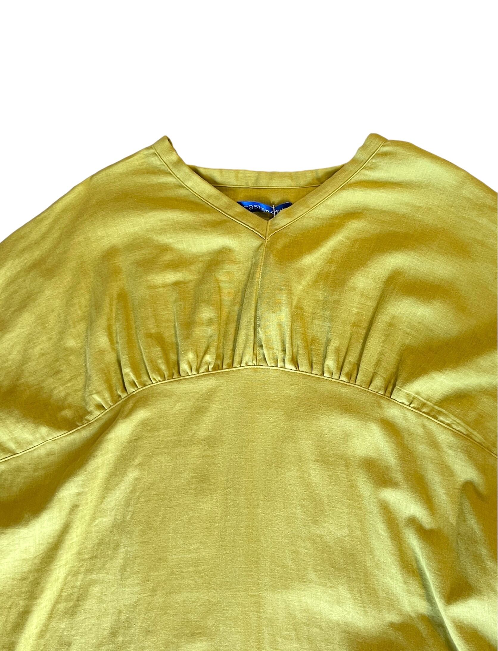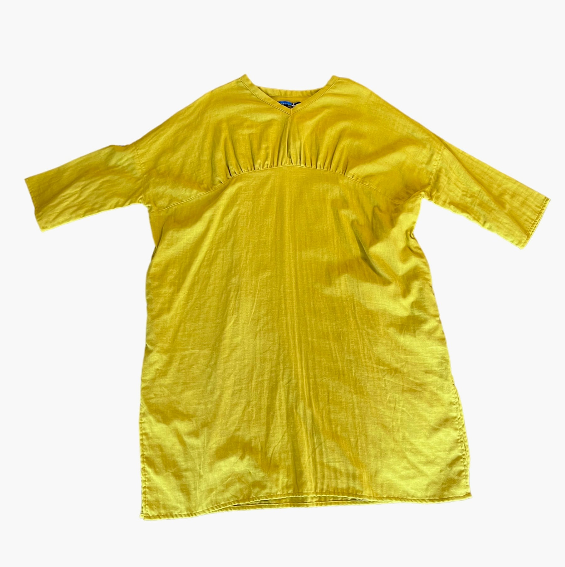 ガーゼ『Vネックギャザーワンピース長袖』マスタード