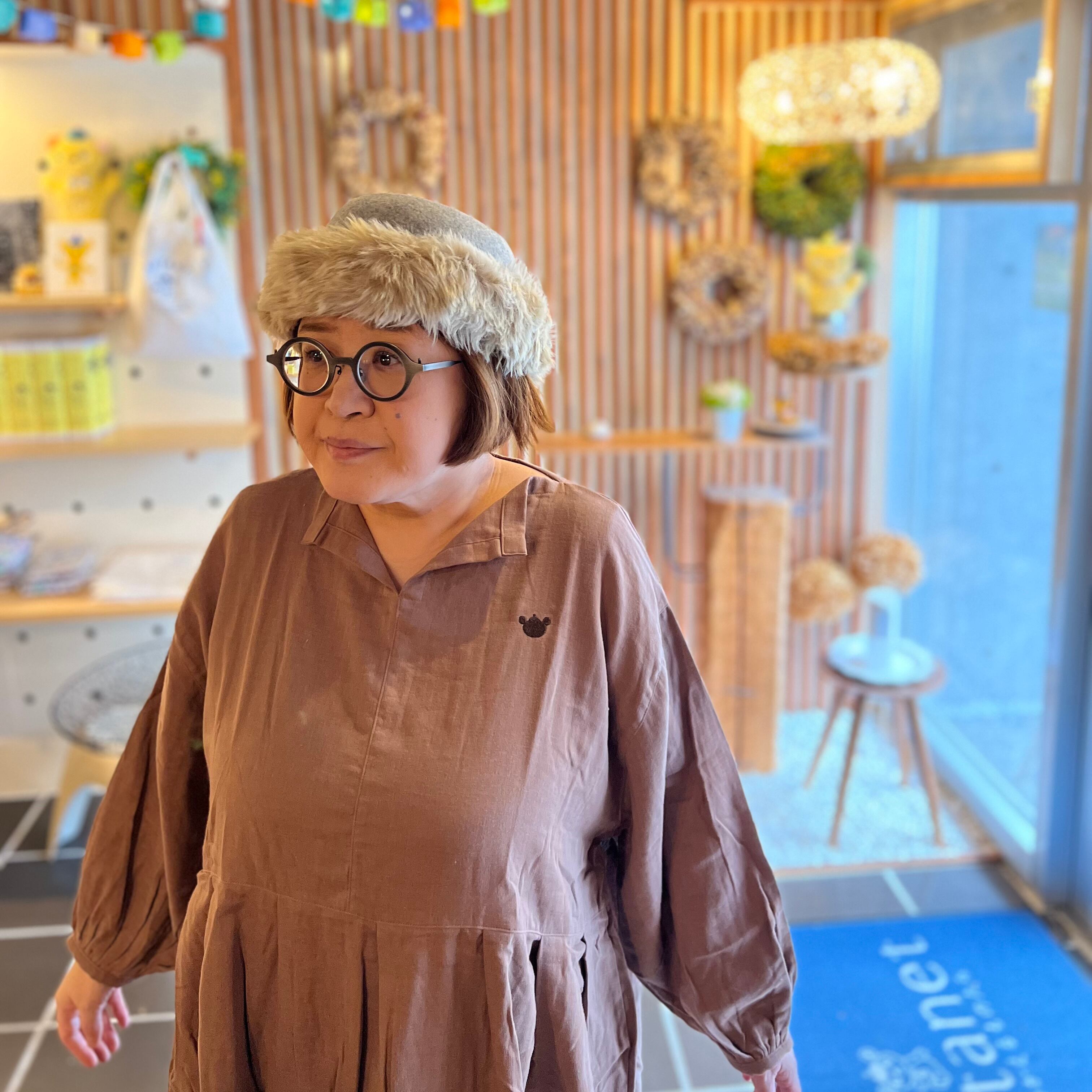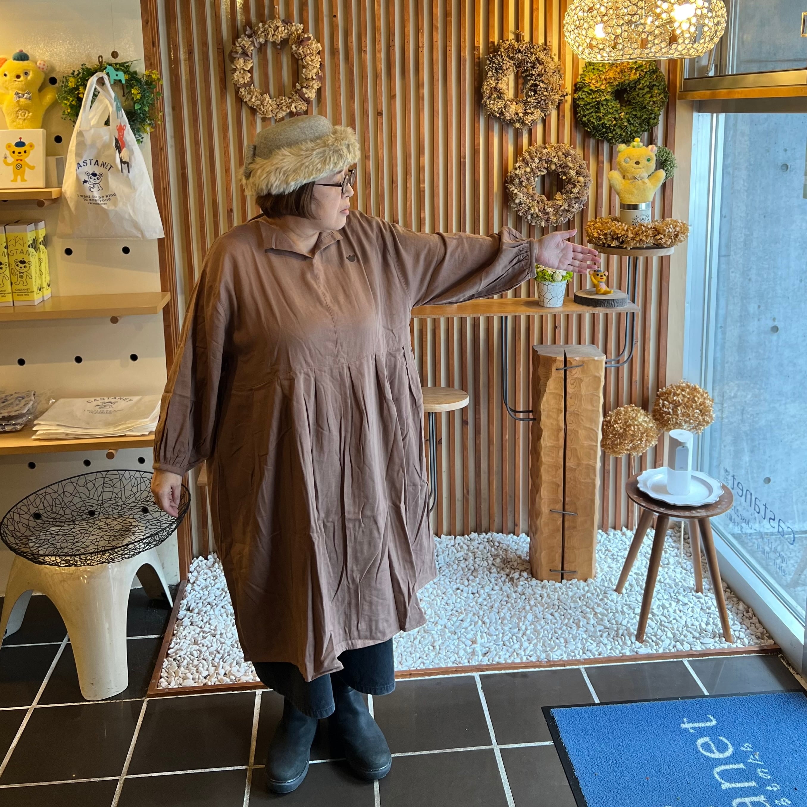 『ガーゼ』スキッパーワンピース長袖・ナッツブラウン